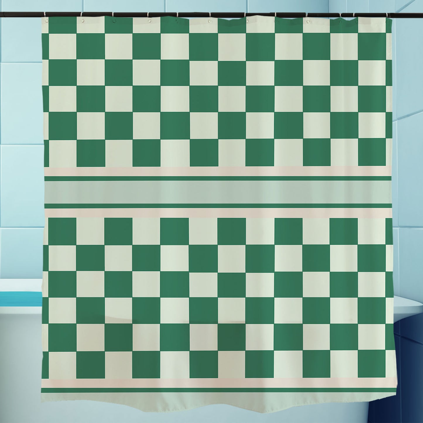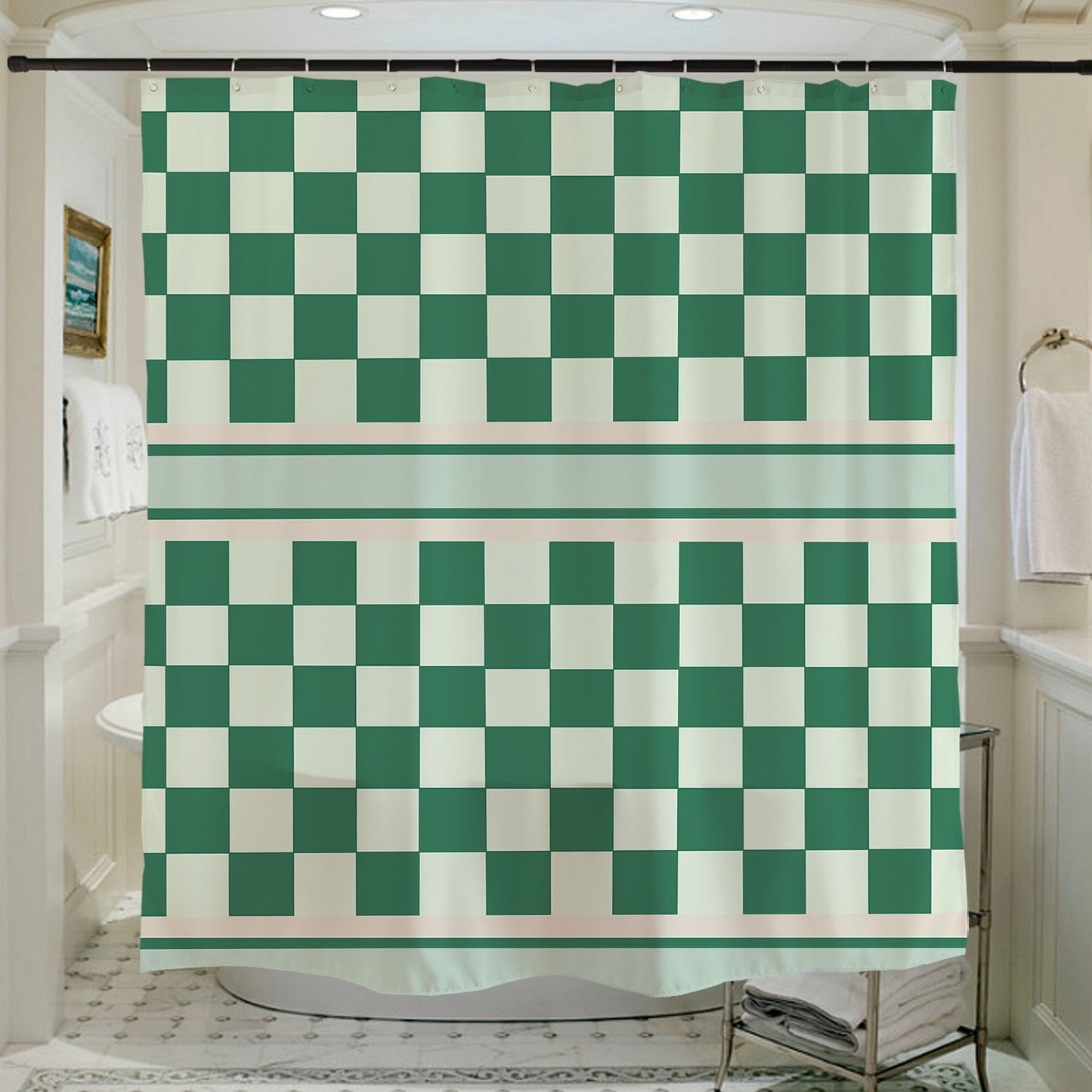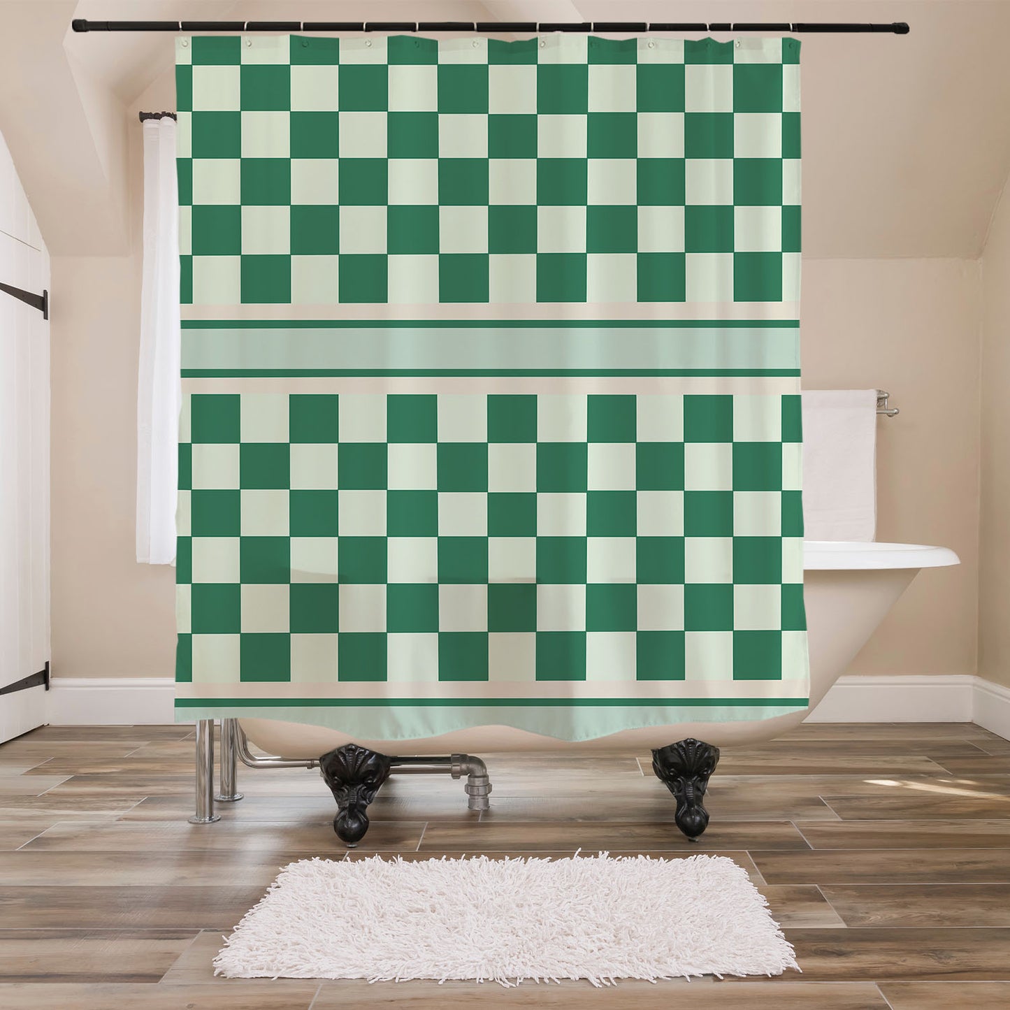 Feblilac Green Checkerboard Pattern Shower Curtain with Hooks
